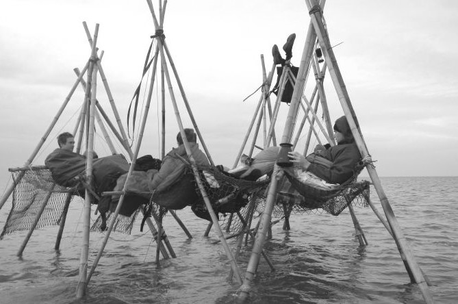 Walking on the Wadden Sea from the island of Texel to the island of Vlieland is even possible. This is not for the faint of heart, though. As the crow flies, this distance is only three kilometers. Walking it is thirty kilometers, semi-encircling the depths of the strait Eierlandse Gat between both islands. It means you have to defy a full high tide at sea, called overtijden in the Dutch language, which can also occur during the night. You build your own scaffold of poles and nets, called a wadstoel (‘Wadden Sea stool’), to hang above the sea during high tide and, if possible, to sleep in. A thrilling experience it must be.