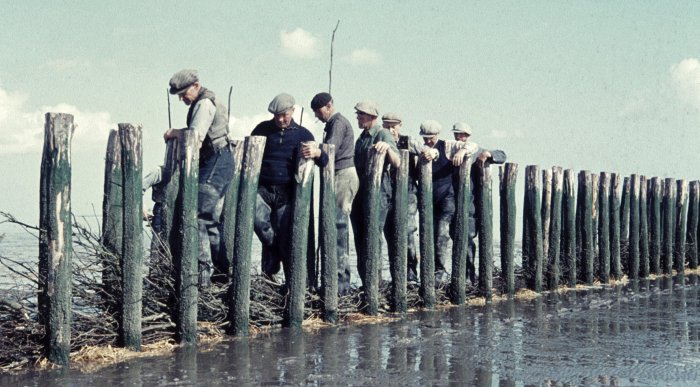The traditional way of reclaiming land was to start building low dykes of earth on the salt marshes to speed up sedimentation. From the twentieth century onward, these dykes were replaced by low dams made of two rows of wooden poles filled with brushwood in between. The so-called rijsdammen or Lahnungen mentioned earlier. The Dutch copied this technique, which was already practiced in the region of Schleswig-Holstein in Germany. But whereas in Germany the construction of rijsdammen was restricted to the already silted-up tidal marshlands themselves, in the Netherlands rijsdammen were constructed on the adjacent mudflats as well. Indeed, on the seafloor itself, only accessible at low tide. They were rows placed both transversely and parallel to the main dyke, thus creating mud fields of exactly one hundred square meters.