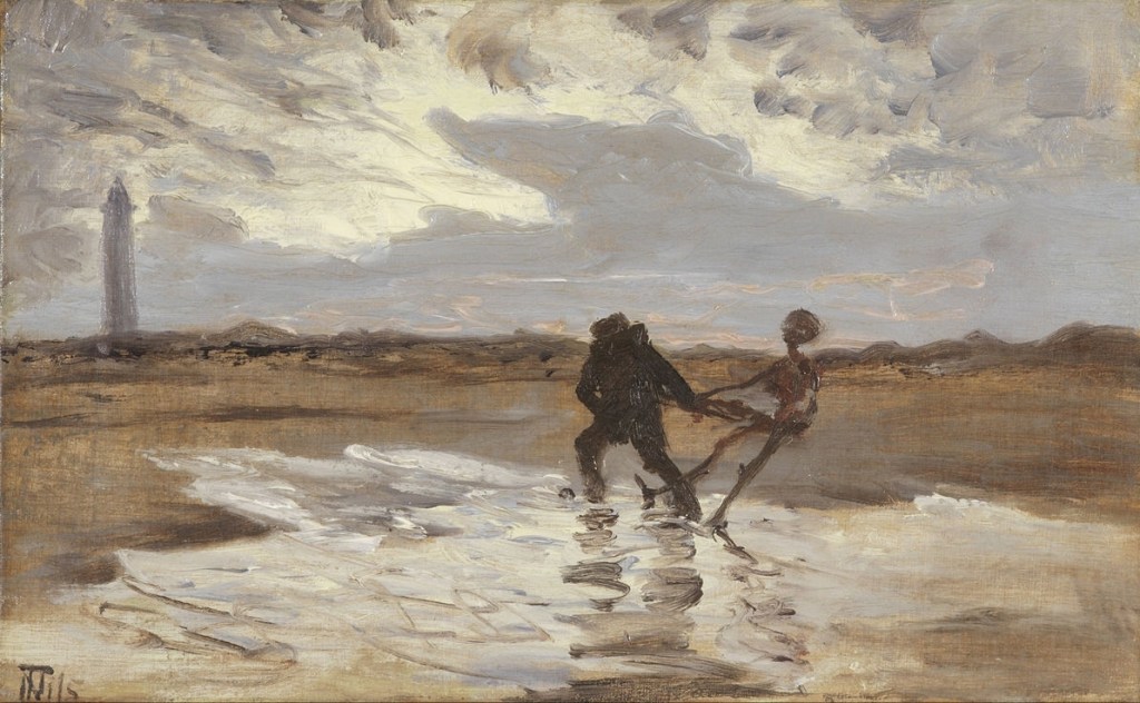 The saga is about two fishermen from the village of Padingbütten, both inexperienced. One day at low tide, they walked with their nets and fish traps onto the flats of the Wadden Sea when they saw a very tall man standing in the distance with a flounder as big as he was. The tall man gestured to the fishermen to come near. The eldest of the fishermen did not trust the whole thing. He considered it was still a long distance, the tide could come in soon, and the flats had their dangers. The other fisherman, however, thought his colleague was a coward. He looked greedily at the tall man’s huge flounder and hoped to catch such a big fish over there, too. The older fisherman warned of the Wattgeist (‘Wadden Sea Ghost’) that lured people too far from the coast, to a place on the flats from where they would never survive. His plea fell on deaf ears because the younger fisherman was too obsessed with the big fish. The older fisherman returned to the shores. His colleague was never heard from again.