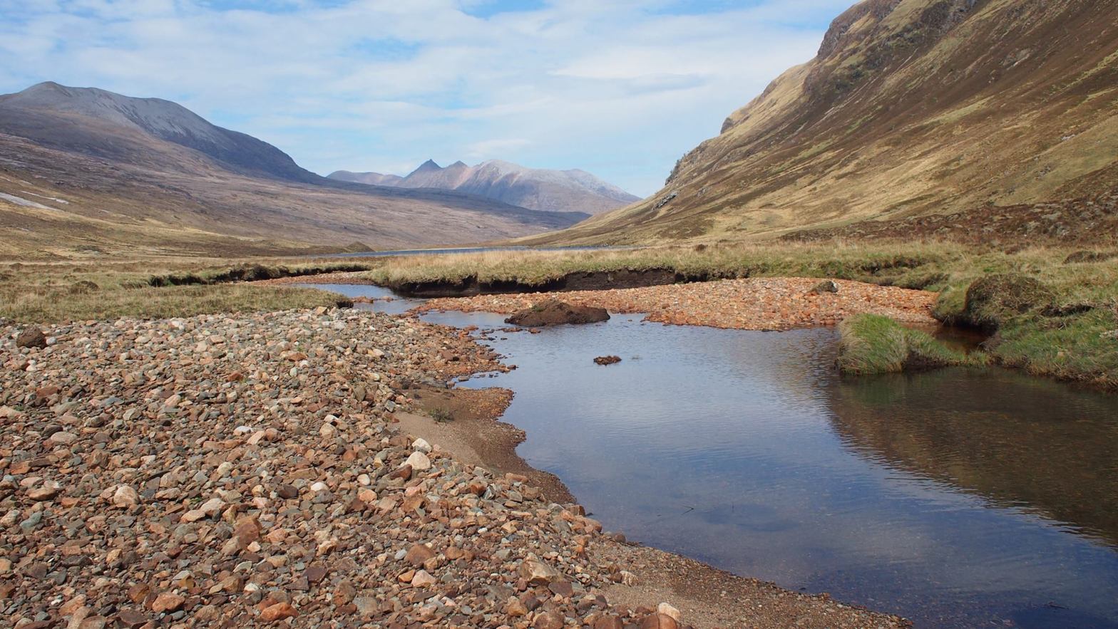After crossing this swamp, it became endless ploughing through bog and high grassy vegetation along the north bank of the loch. Of course, no path. Perhaps one of the most tiring parts of the whole CWT. Halfway through this disaster, you arrive at the River Garbh that you have to cross. You have to walk quite a bit upstream to find a ford. With a lot of rain this river could well be a showstopper. Shoes and socks off and with feet in the cold, refreshing water. Carefully, because the current was quite strong and the algae-covered stones slippery.