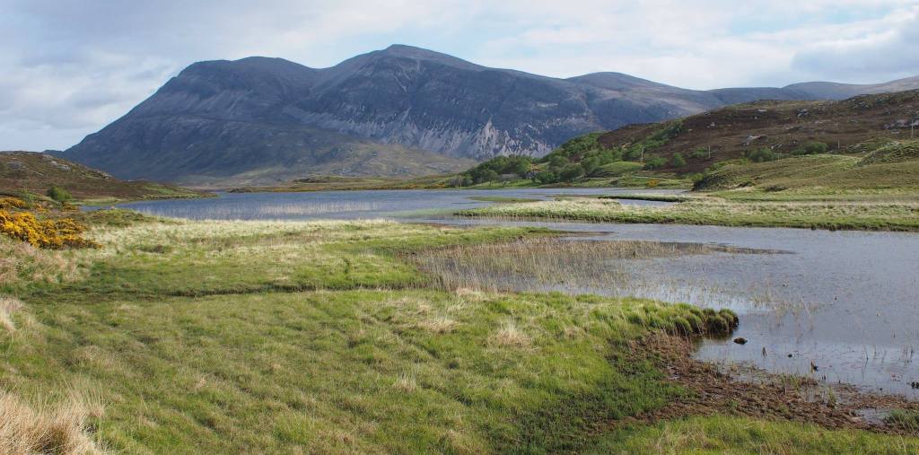 Via the huge Kylesku bridge, which separates Loch Gleann Dubh from Loch a ‘Chàirn Bhàin, the path climbed the Ben Strome. Reasonable climb, but gradually. Loch an Leathiad Bhuain is located on the east-side of Ben Strome. After summiting Ben Strome, the path descends to Loch More and the little village of Achfary. It is no more than a few houses and a church. The narrow secondary road through Achfary leads past the beautiful Loch Stack. You cannot help but to think that the creators of Game of Thrones have made abundant use of the mystically sounding names of this region.
