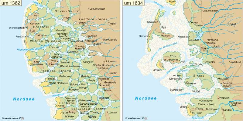 The saga of Rungholt is also a story of the region of Nordfriesland and its people. The Nordfriesen (‘North Frisians’) are the Frisians living in Landkreis Nordfriesland, part of the State of Schleswig-Holstein, as well as the few Frisians living in the outer southwestern corner of the region of South Jutland in Denmark. So, the area stretches from the peninsula of Eiderstedt in Germany to the Bay of Ho near the town of Esbjerg and the island of Fanø in Denmark. In fact, the region of Schleswig-Holstein has been a patchwork of peoples, i.e., Germans, Danes, Jutes, and Frisians, and of languages, i.e., High German, Low German, South Jutlandic, Danish, and — several dialects — of North Frisian for centuries, together with a nervous, jumpy border between Denmark and Germany, dancing both north and south.