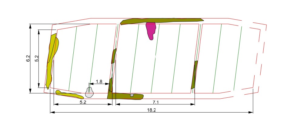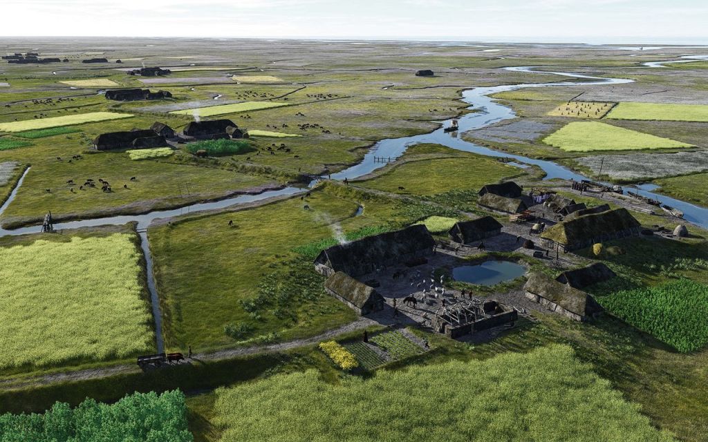A possible hall belonging to the local leader has been identified and dated to the eighth or ninth century. This structure measures approximately 18.2 meters in length and 6.2 meters in width and is single-aisled in design. Unlike other buildings in the area, which typically had walls constructed from turf or clay sods, this hall also featured wooden walls — an exceptional choice, given the scarcity and cost of timber on the salt marshes (Postma 2020; Nieuwhof 2023).