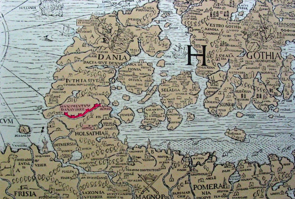 The earliest parts of the Danevirke ‘Danish works’ were built around the year 500. The wall was expanded during the Viking Age. Hence the name Danevirke. It ran from the former Viking port of Hedeby, also known as Haithabu, near the present-day town of Schleswig in the east, then bordering the River Treene, and continued to the salt marshes of Landkreis Nordfriesland in the northwest in Germany. So, a earthen wall running from the Baltic Sea to the North Sea.