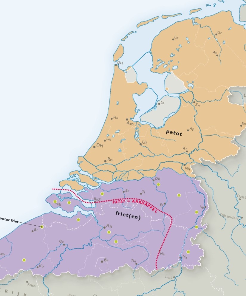 And the names do not stop there. Beyond the nicknames, there are more than 5,000 known varieties of potatoes worldwide — each with its own label. Best not even try to list them all. Add to that the linguistic minefield of French fries, chips, patat/petat, and friet/frieten — all describing those fried, elongated strips of potato — and you have got enough confusion already. The dividing line between friet/frieten and patat/petat in the Netherlands is shown on the map below.