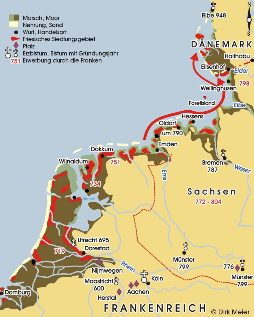 In the fifth century, habitation discontinued in the region of Nordfriesland. Like in the terp region of the Netherlands during the fourth century, here too the inconvenient truth for a while: “you could only hear the seagulls cry.” A dramatic decline of population from ca. 400 until ca. 550. In the fifth century, the land was nearly empty. From the mid-sixth century onward, the region of Nordfriesland was modestly repopulated. Despite these brave new inhabitants, there were merely a few, and the population during the seventh century continued to be modest in the region of Nordfriesland. These immigrants are commonly regarded as Frisian (Majchczack 2022).