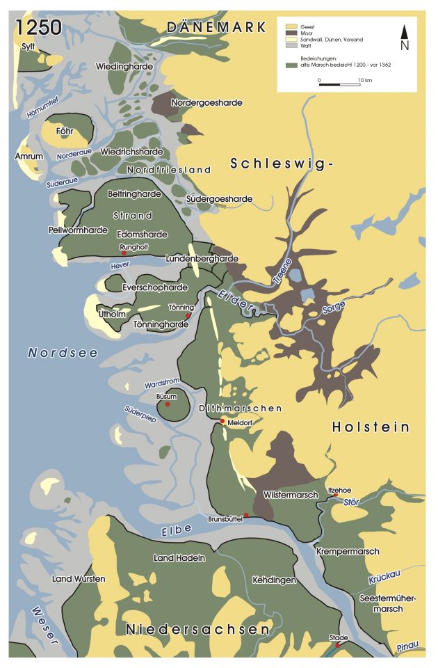 From the twelfth-century chronicler Saxo Grammaticus, we learn that the new migration wave of mainly Ostfriesen (‘East-Frisians’), led to economic disputes between the so-called Geestfriesen predominantly living on the coastal strip on the mainland, on the one hand, and the so-called Marschfriesen or island-Frisians on the other hand. The Geestfriesen were bound to the leges Danica (‘laws of the Danes’), while the Marschfriesen were bound to the leges Frysonica (‘laws of the Frisians’). Therefore, both had different toll tariffs to pay when passing the narrow Schlei inlet. Furthermore, the Danish king granted the Marschfriesen free use of the tidal marshlands against a yearly payment.