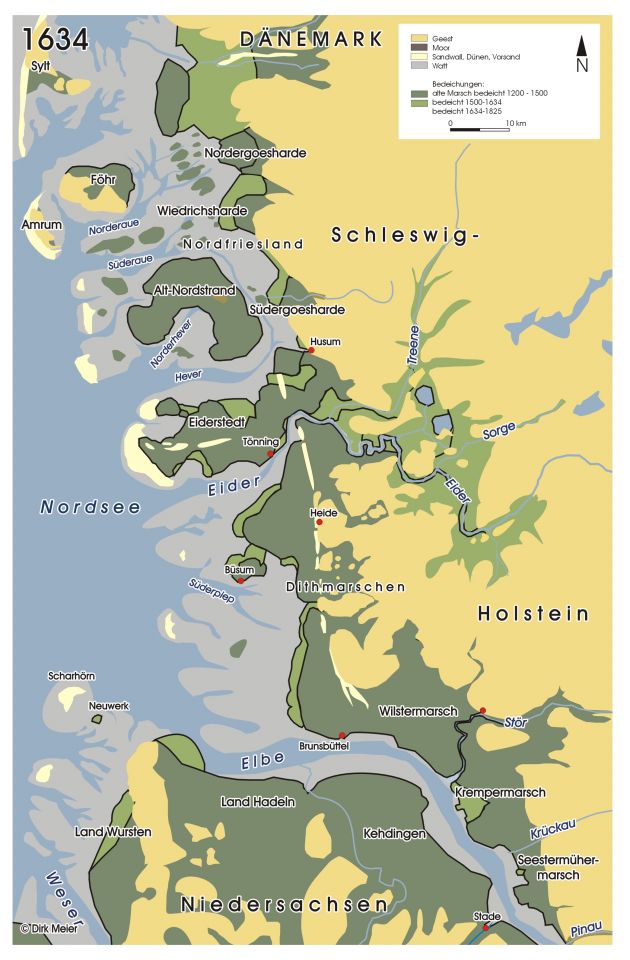 During the High Middle Ages, the population of Nordfriesland increased further, despite the influence of the sea had become stronger from around the year 1000 or so. And, at last, from the eleventh century onward, also terps were being built. In addition, in the twelfth and thirteenth centuries, besides terps being raised, the construction of dykes took a flight, too. Salt marshes, which had grown naturally and silted up over the previous centuries, had become suitable for livestock and for permanent habitation. The so-called Marschfriesen moved in. From then on, these tidal marshlands were protected with dykes from the sea.