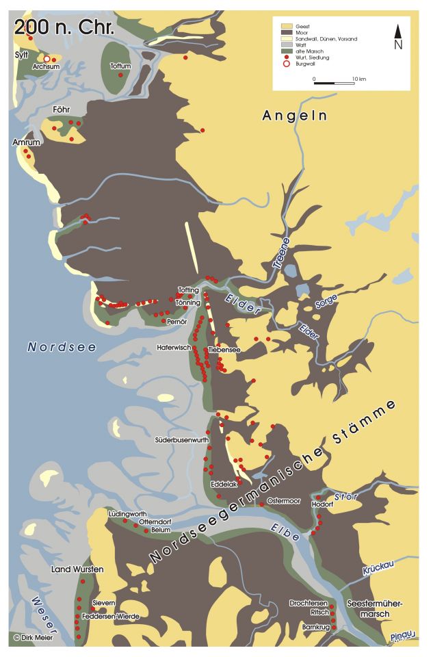 During the Roman period, the coast of Nordfriesland was relatively densely populated. Habitation concentrated on the so-called geests. Geests are sandy and gravelly soils formed as glacial outwash plain (viz. moraines). The word geest derives from the Frisian word güst, which means ‘infertile land’. The geests were formed during the Saale glacial period. More precisely, settlements were located at the edge of geests near the fertile salt marshes. Especially, habitation existed on the islands of Föhr, Sylt (also Archsum), Amrum, and Wiedingharde, and on parts of the Eiderstedt peninsula. Also, the salt marshes south of what is Nordfriesland today, the region of Dithmarschen, were quite densely populated during the Roman period.