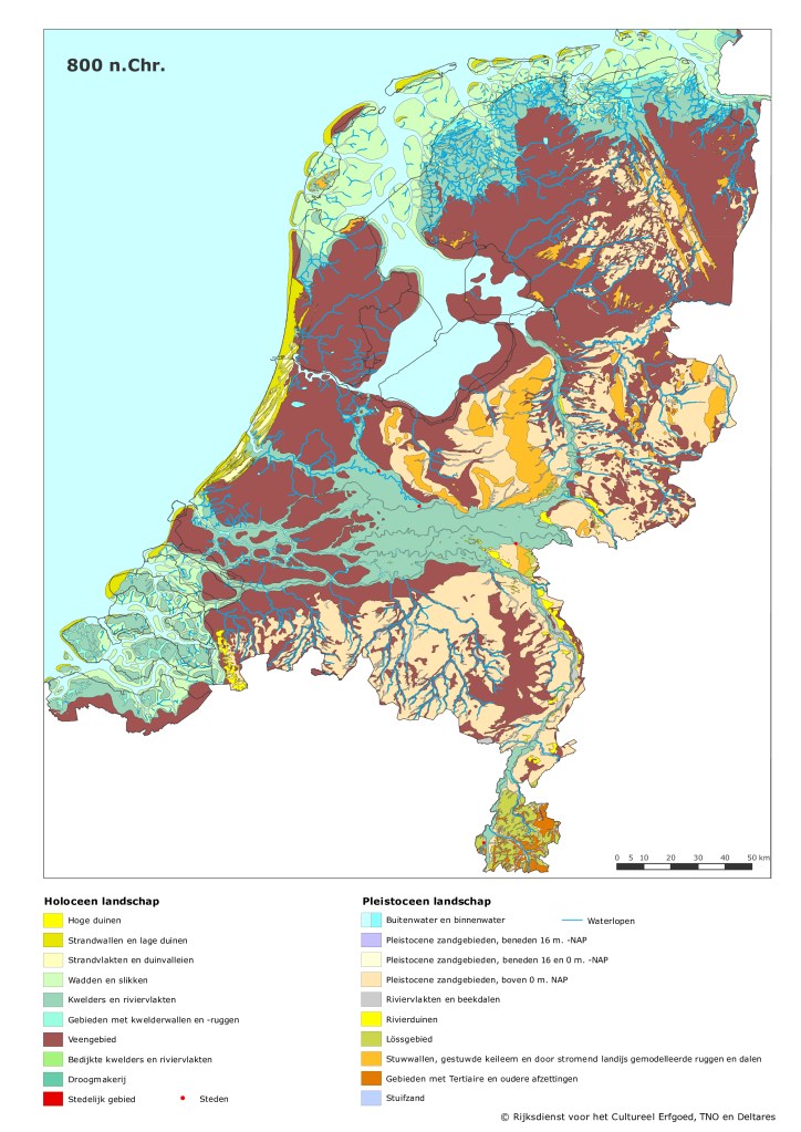 Please note that the surface of Zuid Holland was 20% (!) of today’s Zuid Holland. Today is spans a 3.400 km2, while back in the early medieval times it was covering only 650 km2. And then still only 300 km2 was habitable. What caused this huge difference? Both the retreating sea due to climate change and the people reclaiming land increased the habitable surface.