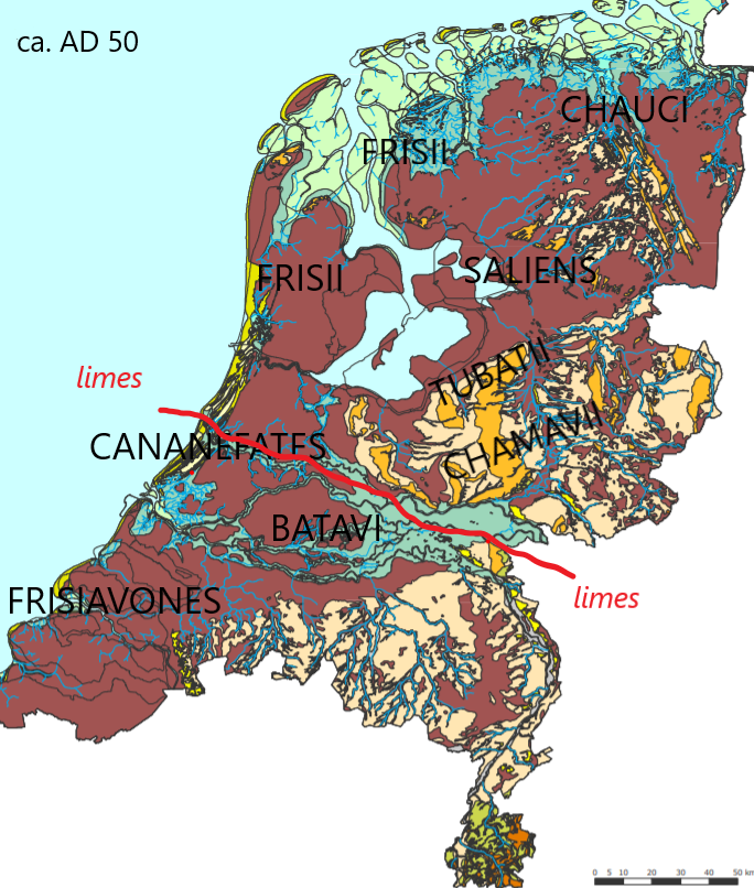 The minores Frisii ‘lesser Frisians’ had their territory in what is today the province of Noord Holland in the Netherlands, specifically along the western North Sea coast of the country. Along the North Sea coast further south, in what is the current province of Zeeland, south of the Limes ‘border’ Germanicus, and thus within the Roman Empire, lived the Frisiavones tribe. The Frisiavones can be considered Romanized Frisians (IJssennagger 2017). The coastal area between the Frisiavones tribe and the minores Frisii tribe was inhabited, from the first century AD onward, by the Cananefates tribe, more or less in the area of the modern city of The Hague.
