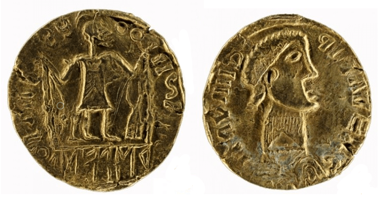 A handsome-looking guy, wasn’t he? The coin shows traces of having been used as a pendant — a fairly common practice at the time. Some scholars have even suggested, sporadically, that it might originally have been a bracteate rather than a solidus. We believe it was initially a solidus: a coin that served both as currency and as a prestige object, often hoarded. Not long after this solidus was issued, silver pennies or sceattas began circulating in large numbers, supporting the expansion of Frisian supra-regional trade. Incidentally, the runes are written backward — again, not unusual for the period.