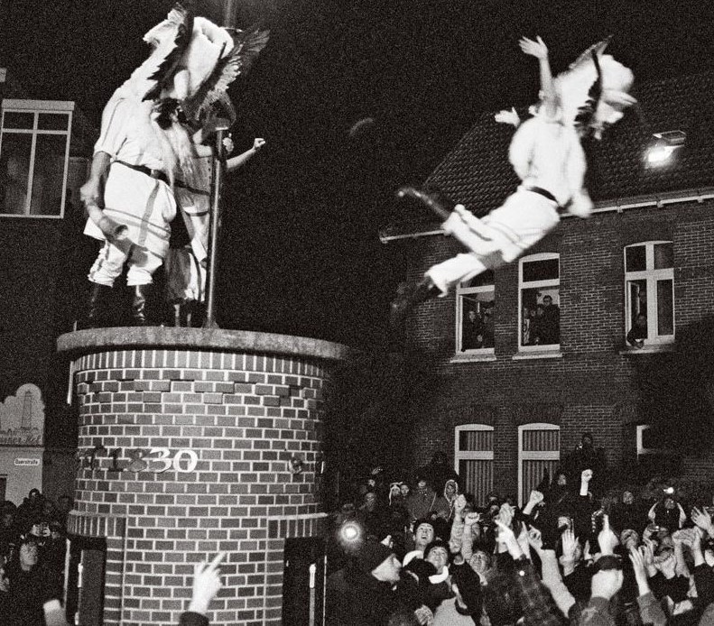 Each year, during the night of 5 and 6 December, six men dress up as Klaasohms and one as Wiefke ‘girl’. It means they are dressed in sheep skins and feathers and wings of birds (seagulls). After they have scared the island and hunted for women, they even try to fly away. That is done by jumping from an elevation onto the crowd below. The village of Schweindorf and the island of Borkum are both in former territory of Frisia and less than fifty kilometers apart, as the crow flies. Are the ‘Klaasohms’ therefore, in fact, representations of Weladu? The feast is not without controversy because of its humiliation of women, including hitting them on their backside with a cow horn.