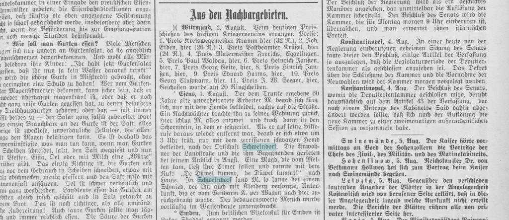 Then there is this story of a disturbed man, an article posted in the weekly Jeversches Wochenblatt, edition of August 6, 1912. A story that feels like history repeating, only the ingredients ‘Schweindorf’, ‘blacksmith’, ‘Devil’ and ‘woman’ have been mixed up.