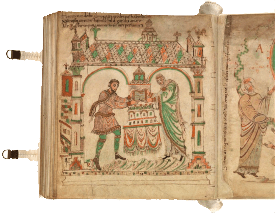 Four King’s Charters — The library of the Abbey of Egmond (probably) also kept the so-called Four King’s Charters. In these charters, the West-Frisian counts received gifts and fiefs from (West and East) Frankish kings. From the twelfth century onward, these four charters are being presented by the Egmond tradition as the formal bases of the county and dynasty of the West-Frisian counts. The four charters are: 889 gifts of King Arnulf of Carinthia to Count Gerulf (four years after the death of Godfrid the Sea-King); 923 gifts of King Charles the Simple to Count Dirk I; 969 gifts of King Lothair of France to Count Dirk II, and; 985 gifts of Holy Roman Emperor Otto III to Count Dirk II. From these charters we know what the size and nature of the territories that were attributed to the West-Frisian Gerulfings by the Frankish kings. Copies of these four charters have been preserved in the Cartularium ‘cartulary’ of Egmond written in the fourteenth century.