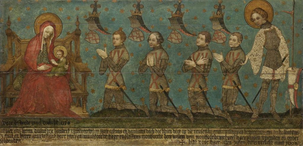 From the second half of the thirteenth century, the counts of Holland waged many, costly wars against the Frisians in an attempt to submit the still free peasant-republic of Frisia, what is now the province of Friesland. The most famous and most disastrous one, was the already mentioned Battle of Warns in the year 1345, in late September. Actually, the battle took place at the Abbey of Saint Odulf near the town of Stavoren, also called Staveren. Not only Count William IV was killed, but also three of the lords of Montfoort. This was not your regular thing to do during warfare. You would capture counts and lords and ask for a huge ransom after the battle. At least, this ‘uncivilized behaviour’ of Frisians left the Rijksmuseum ‘national museum’ in the city of Amsterdam with one the oldest paintings, if not the oldest, of the Netherlands, painted at the end of the fourteenth century: the Memorial Tablet shown below.