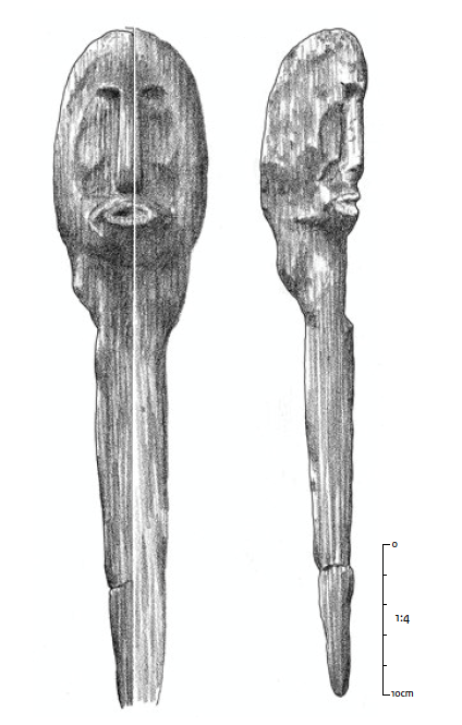 The third ring, or inner circle, was the terp village with houses and fresh water wells. Wells often contained deposits, too, like spoke wheels, horse heads, etc. Probably also with a ritual meaning. An interesting artifact has been found in a dung pit in the terp of the village of Wartena in the province of Friesland, namely a wooden phallus. It is dated to the Roman Period.