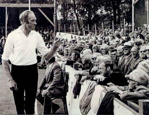 Furthermore, Hotze had a striking appearance. Not only his length, but also the way he was dressed. He never stopped wearing the pre-WW2, traditional black leotards with a white shirt with collar. He also wore traditional black socks, instead of spikes. It gave him another nickname, held op sokken ‘hero on socks’. This was his appearance when all other players on the field were dressed in modern shorts, sport shoes, etc. for years already. Through the years, Hotze had more and more difficulties to find new leotards once the old one was worn-out. And then his size. The true reason, by the way, why he kept wearing leotards was, according to himself, his white bony legs.