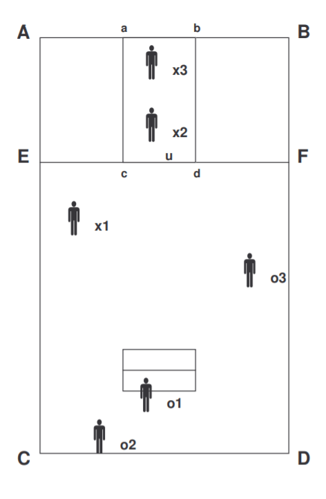 The opslagpartij, or serving team, (O) is positioned in zone C-D-E-F. Of the slagpartij, or receiving team, (X) 2 players are positioned in the slagperk A-B-C-D zone (i.e. receiving zone), while the third remaining player of the slagpartij is positioned in the field of the opslagpartij, so to be able to answer any action from the opslagpartij. After change of sides and functions, this person takes care of the serve of his team.