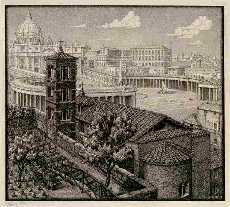 With the construction of the Saint Pieter’s Basilica in the sixteenth century, the church was almost knocked down. Thanks to the fact it was located on the hill, it escaped its fate. Most recently, before the Second World War, the Borghi, that is, the direct neighbourhoods of the Saint Peter’s Square, were cleaned up. Because the Nederlands Historisch Instituut in Rome feared the Church of the Frisians would be ‘cleaned up’ as well they asked the Frisian artist M.C. Escher (1898-1972) to make a lithograph of the church. Miraculously the church survived again. Panic for nothing, but at least we got a lithograph of Mauk Esher out of it.