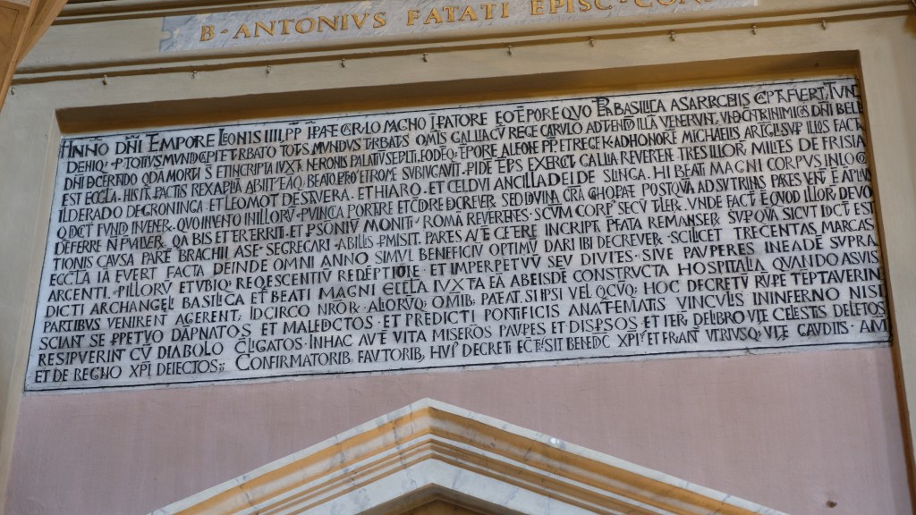 IN NO DNI TEMPORE LEONIS IIII PP IPATE CARVLO MAGNO IPATORE EO TEPORE QVO PETRI BASILICA A SARRACENIS CAPTA FUERAT, TVNC DENIQ P TOTIVS MVNDI CAPITE TVRBATO TOTVS MVNDVS TVRBATVS OMIS GALLIA CV REGE CARVLO AD TVENDV ILLA VENERVNT. VNDE CNTRA INIMICOS DNI BELLA DNI DECERTANDO QDAM MORTVI S ET IN CRIPTA IVXTA NERONIS PALATIVM SEPVLTI, EODD TEPORE A LEONE PP ET REGE K AD HONORE MICHAELIS ARCGLI SUP ILLOS FACTA EST ECCLA. HIS ITA PACTIS REX APVLIA ABIIT EAQ BEATO PETRO ET ROME SVBIVGAVIT. P IDE TEPVS EXERCITV GALLIA REVERTENTE TRES ILLORV MILITES DE FRISIA ILDERADO DE GRONINGA ET LEOMOT DE STAVERA ET HIARO ET CELDVI ANCILLA DEIDE SLINGA. HI BEATI MAGNI CORPVS IN LOCO Q DICIT FVNDI INVENER. QVO INVENTO IN ILLORV PVINCIA PORTARE ET CDIRE DECREVER SED DIVINA GRA COHOPANTE POSTQVA AD SVTRINAS PARTES VENT E APLIVS DEFERRE N PVALVER QA BIS ET TER TERRITI ET P SONIV MONITI ROMA REVERTENTES SCVM CORP SECV TVLER VNDE FACTV E QVOD ILLORV DEVOTIONIS CAVSA PARTE BRACHII A SE SEGREGARI AB ILLIS PMISIT. PARTES AVTE CETERE IN CRIPTA PFATA REMANSER SUP QVA SICUT DICTV EST ECCLA IA FVERAT FACTA DEINDE OMNI ANNO SIMVL BENEFICIV OPTIMV DARI IBI DECREVER SCILICET TRECENTAS MARCAS ARGENTI P ILLORV ET VBIQ REQESCENTIV REDEPTIONE ET IM PERPETVV SEV DIVITES SIVE PAVPERES IN EADE SVPRA DICTI ARCHANGELI BASILICA ET BEATI MAGNI ECCLA IVXTA EA AB EISDE CONSTRVCTA HOSPITALIA QVANDO A SVIS PARTIBVS VENIRENT AGERENT. IDCIRCO NROR ALIORVQ OMIB PATEAT SI IPSI VEL QCVQ HOC DECRETV RVPE TEPTAVERINT SCIANT SE PPETVO DAPNATOS ET MALEDICTOS ET PREDICTI PONTIFICIS ANATHEMATIS VINCVLIS IN INFERNO NISI RESIPVERINT CV DIABOLO CLIGATOS, IN HAC AVTE VITA MISEROS PAVPES ET DISPSOS ET ITERV DE LIBRO VITE CELESTIS DELETOS ET DE REGNO XRI DEIECTOS. CONFIRMATORIB FAVTORIB HVI DECRETI EC TR SIT BENEDIC XRI ET FRVANT VTRIVSQ VITE GAVDIIS AM