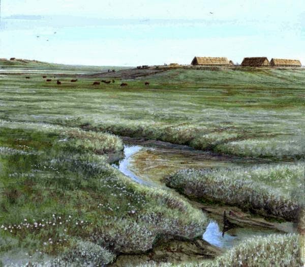 Concerning the pits filled with rainwater, probably collected from the house roofs, they might refer to what is known in the region of Nordfriesland as a feeting or feith, in the province of Friesland as a dobbe, and in the province of Groningen as a dob. Check our post Groove is in the Hearth. Very superstitious, is the way about collecting rainwater with grooves on terps, and all the superstitious and pagan practices that were once part of it. Dobbe or feeting earthworks are now mainly used on the tidal marshlands for the freshwater supply for livestock; cattle, sheep, and horses. You can find many at the tidal marshlands of Noarderleech in the province of Friesland.