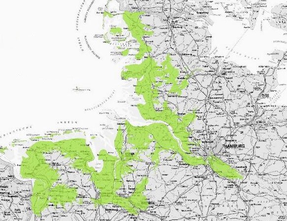Adding up all things, the land was there for the taking by the sea in the High and Late Middle Ages. Waiting for disaster. This was just what happened. The inland sea Zuyderzee (‘southern sea’), the River Lauwers Inlet, the Jade Bight, and the Dollart Bight were created or enlarged during great storm floods. Above all, most of the land of the region of Nordfriesland was washed away during this time. It went with a massive loss of humans, livestock, farms, and houses. As they say in the region of Land Wursten, die Flut frisst Korn, Vieh und Menschen (‘the flood eats corn, livestock, and people’). Not only were people killed during the flood itself, but also secondary casualties due to famine and diseases afterwards could be significant. For example, during the summer of 1826, one-and-a-half years after the great flood in February 1825, many people died of malaria. This was because of the combination of a still very wet landscape and warm temperatures, which are excellent conditions for malaria mosquitoes (Smith 2025). In addition, because of the massive loss of land, many Frisians in the regions of Nordfriesland and Ostfriesland living on islands and near the shores were forced to resettle more inland on higher and safer grounds. Environmental refugees.