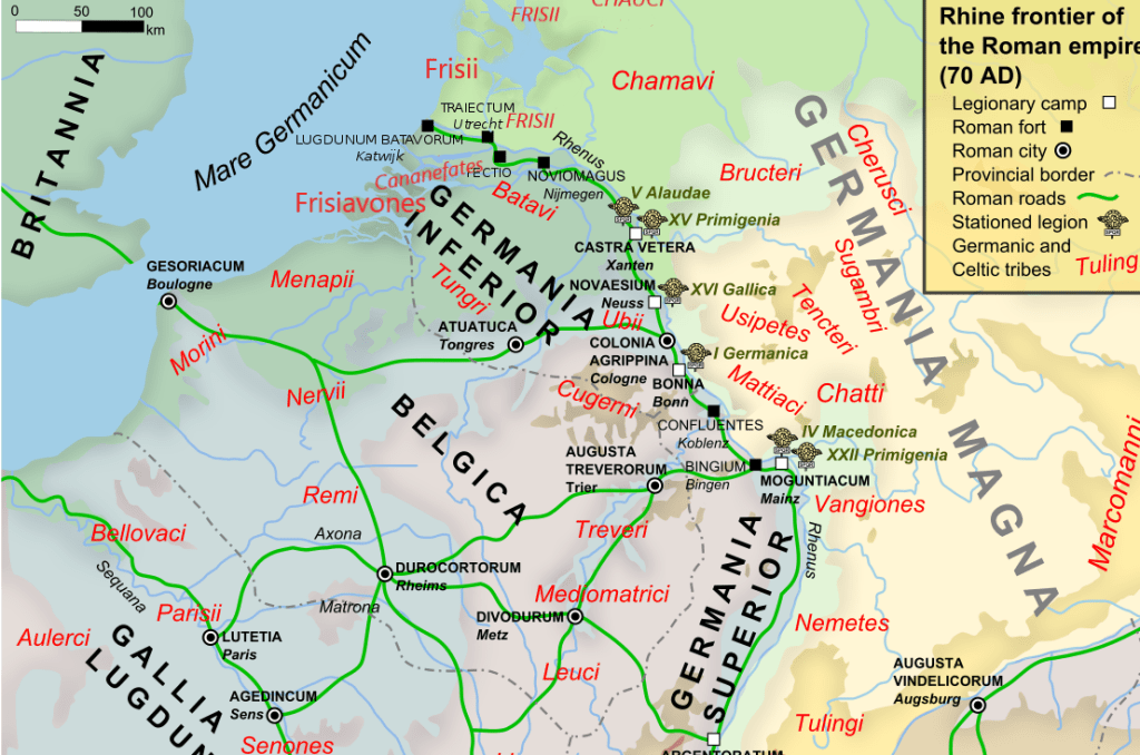 Also during the same uprising, a cohort of Frisians and Chauci operated far upstream along the River Rhine, at the town of Tolbiacum — present-day Zülpich in Germany — near the modern city of Bonn. These Chauci and Frisian rebels were ultimately defeated by the people of Tolbiacum. Their victory, according to Tacitus’ Historiae, was achieved through cunning and perhaps the overconfidence of the northern warriors. The citizens of Tolbiacum offered the Chauci and Frisians a grand banquet with plenty of wine — they were, after all, in a prosperous wine region. Once the men had fallen asleep, flushed and drunk, the doors were shut and the building set ablaze.