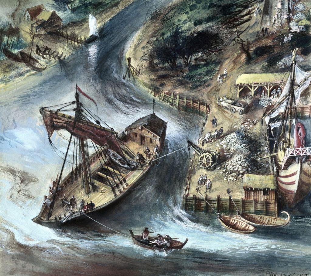 In the town of Bruges in Flanders, Belgium, a cargo ship was found, dated around 200 AD. It was a flat-bottomed vessel, approximately fourteen meters long and equipped with a sail. Similar to the Rhine barges mentioned earlier, this ship was also carvel-built. Another ship, known as the Blackfriars I shipwreck, was excavated in London. This ship, dating back to the second century, also had a sail. Both the Bruges and Blackfriars I boats are considered ancestral to the cog ship, also known as kugg or kogg (e). The cog ship, with its significant carrying capacity, became the dominant ship type of the Early Middle Ages and was believed to be the typical vessel used by Frisian merchants. It is even thought to have been developed by the Frisians themselves (Westerdahl 1992).