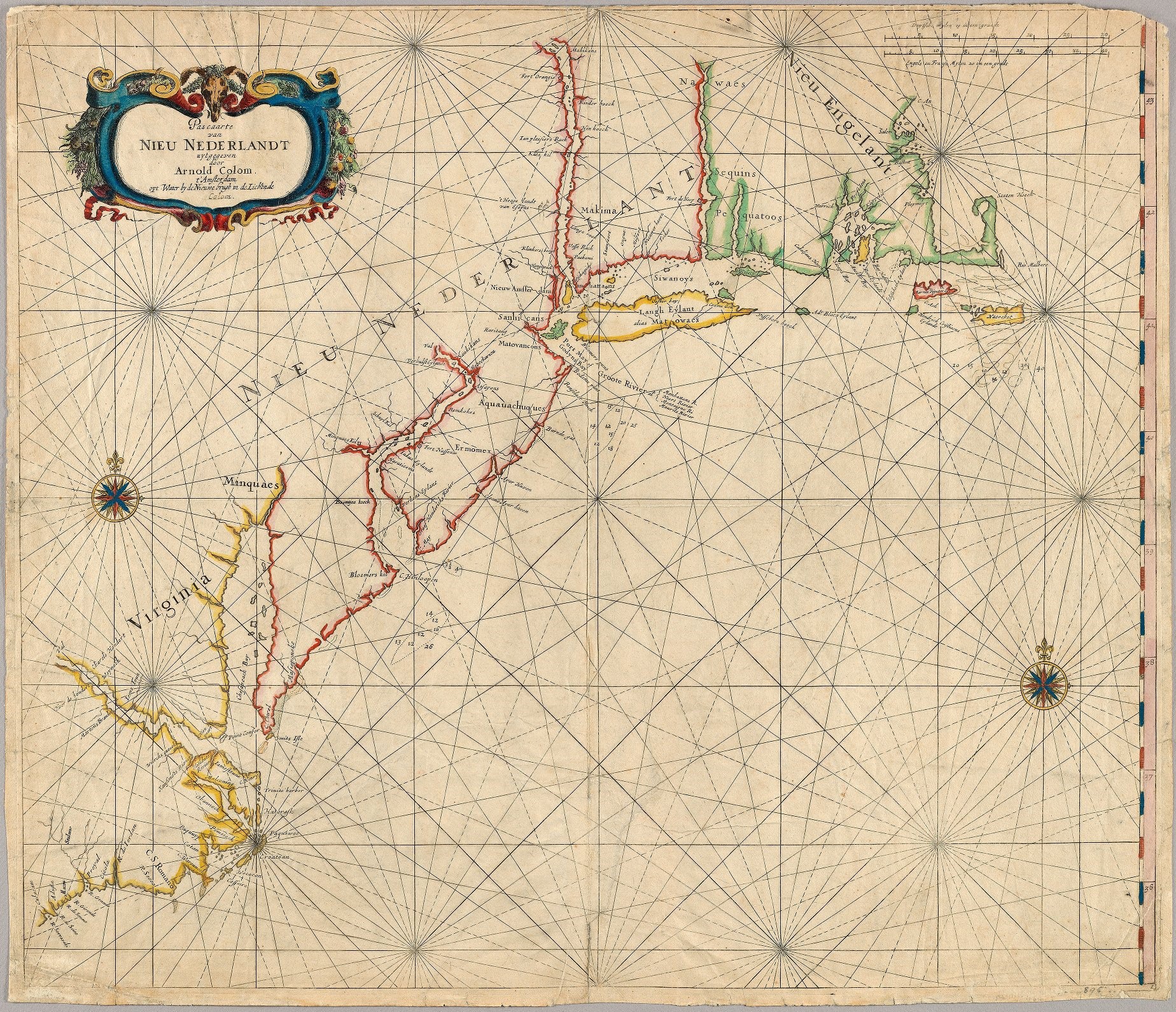 The colony of New Netherland, a new province of the Dutch Republic, was quite a possession. It stretched roughly from present-day Albany, New York, in the north to Delaware Bay in the south, encompassing all or parts of what would later become New York, New Jersey, Connecticut, Pennsylvania, and Delaware. In total, it covered about 700 kilometers of coastline, extending from the (English) peninsula of Cape Cod down to the Delmarva Peninsula.