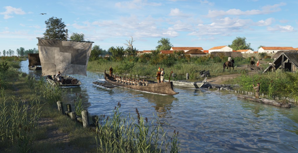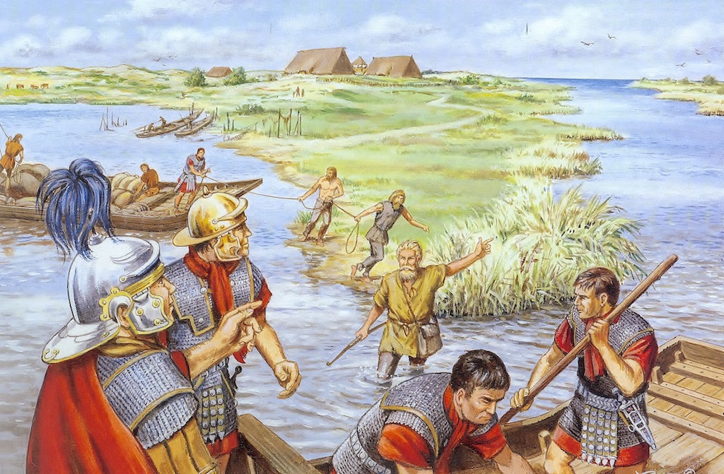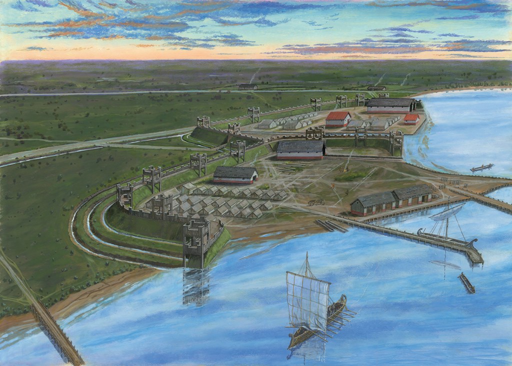 General Corbulo is also remembered for the canal he ordered to be dug between the mouth of the River Meuse — the Haringvliet, known to the Romans as the Helinium — and the mouth of the River Rhine. The town of Forum Hadriani was later built beside it, and today the Vliet waterway preserves the line of Corbulo’s canal, which once ran parallel to the coast. He was not the first Roman commander to reshape the waterways: between 12 and 9 BC, General Drusus had a series of canals constructed, probably along the course of the River Stichtse Vecht in the province of Utrecht, to connect the fortress of Fectio (near the modern town of Vechten) with Lake Flevum (the present Lake IJsselmeer). From there, Roman ships could continue sailing north (Verhagen 2022). Drusus’s tireless efforts to improve navigation even survive in place names: the town of Drusenheim in France, where he once built fortresses on the River Rhine, still recalls him. Fittingly, a blue-painted ferry named Druss now shuttles back and forth across the river between France and Germany (Hendriksma 2017).
