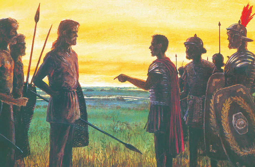 In AD 16, General Germanicus Julius Caesar launched his final campaign to subdue the tribes north of the Lower Rhine. Commanding a massive fleet of four legions, he sailed through the Wadden Sea and reached the muddy estuary of the River Ems, the borderland between the Frisians and the Chauci. There, Gallic and Germanic auxiliaries, who had marched north overland, joined the main force. At this point, the Frisians maintained friendly relations with Rome. From the Ems, Germanicus advanced eastward toward the River Weser to confront the Germanic coalition led by Arminius, the formidable commander of the Cherusci.