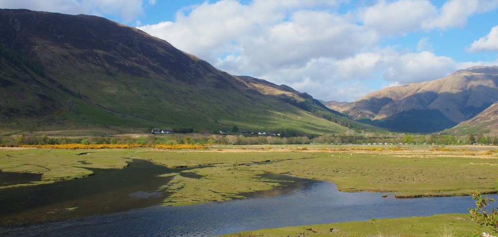 After leaving the gorge and crossing the River Elchaig, the bastard took his only short break that day. Some food and cold instant coffee. Knowing it was going to be quite a march if he wanted to make it to Strath Carran, he had to pick up his pace to make up for the time lost that morning. The road westward went through the beautiful Glen Elchaig, full of wild deer, semi-tame Highland cattle, and, of course, sheep. A sign warned of Highland cattle when they have calves. Plenty of calves everywhere. It was spring.