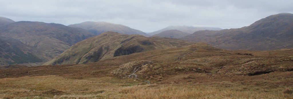 Unfortunately, things went wrong right away that day. After several kilometers of hard climbing, the bastard arrived at a waterfall that did not match the description of the Falls of Glomach. So, a lot of backtracking, and again a climb of 700 meters up Bealach na Sróine. At the top, it was windy and cold, and it started to drizzle. The little path along the Falls of Glomach was truly scary. The guidebook advises to be careful on this track in wet and windy weather, which it never is in Scotland… It is the highest falling waterfall in the UK. One hundred meters of free fall. The muddy path, just about 10 centimeters wide, clings to the slope above the waterfall, was eerie and barely visible. No possibilities to hold on to anything either. Only grass to grab that obviously would not be strong enough. A path and risk you only take when the alternative is backtracking many kilometers. Risk and physical effort, an exciting combination.