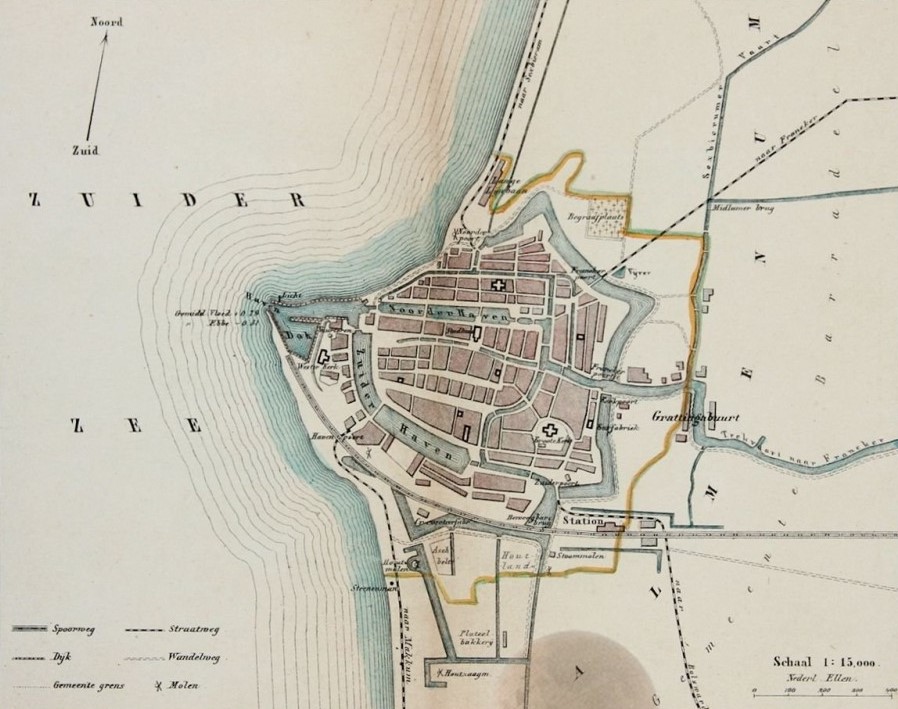 On the south bank of the mouth of the stream Voorstraatslenk, there used to be a hand-dug pond. This pond supplied the settlement with sweet water in the otherwise salty environment of the former tidal marshlands. The current street names Vijverstraat and Vijver, previously written as Fijuer, still remind us of this pond (Schroor 2015). On old sixteenth-century charts, the pond is still visible. Vijverstraat ‘pond street’ is also the location of a former brothel, situated close to the gloomy harbour and dockyards. We will delve into more details about that later.