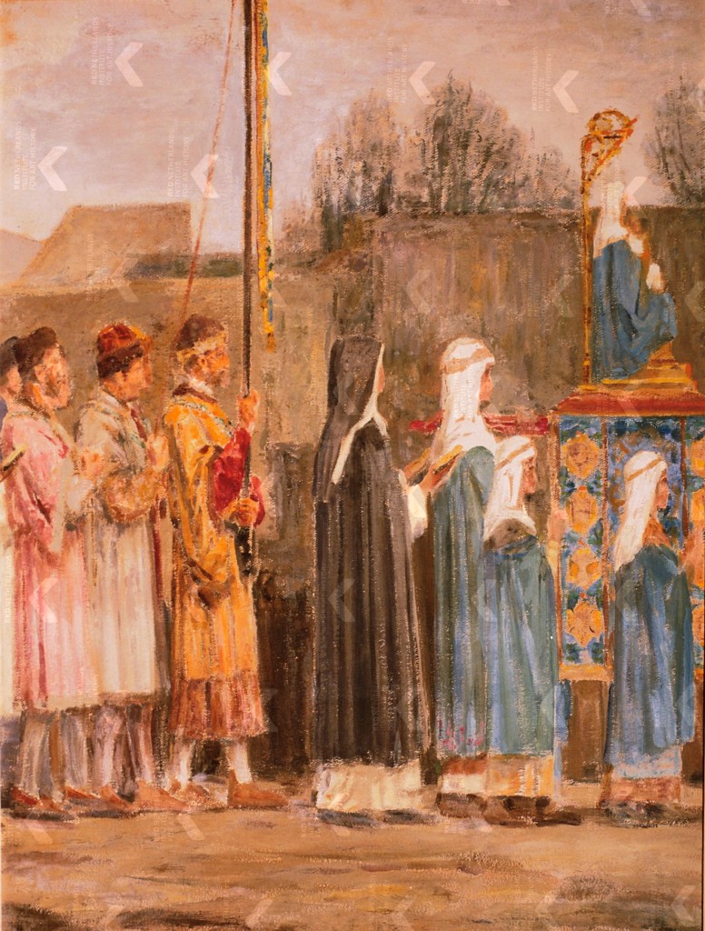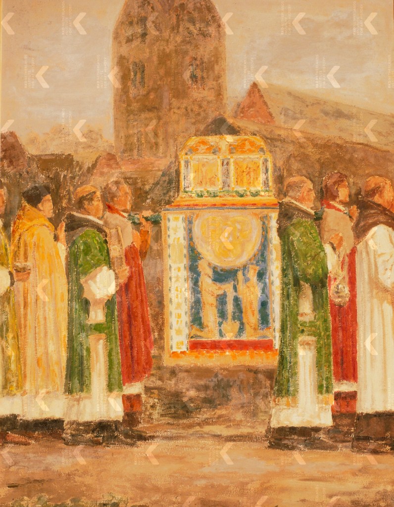That the dead body of a spiritual person could not be moved is a storyline that can be found in the old accounts about Saint Fris as well. Fris is a Frisian saint, said to be the son of King Radbod of Frisia (died 719), venerated in the south of France to this day; see our blog post Like Father, unlike Son. Un saint frison en France. Another example where this dead-weight situation occurs is with Saint Odulf, Apostle to the Frisians in the ninth century, when they tried to move his relics illegally from Evesham Abbey. Impossible to move. Find in our blog post Stavoren. A balancer on a slack rope of religion, trade, land, water, Holland, and Frisia an elaborate history of Saint Odulf in Frisia. A final example we must list is that of Saint Boniface. When he was murdered in Frisia in 754 and they tried to bury him, the body was too heavy to be moved. When the monks understood this was a sign Boniface wanted to be buried in the city of Mainz, suddenly his body could be lifted (Arnold 2024).