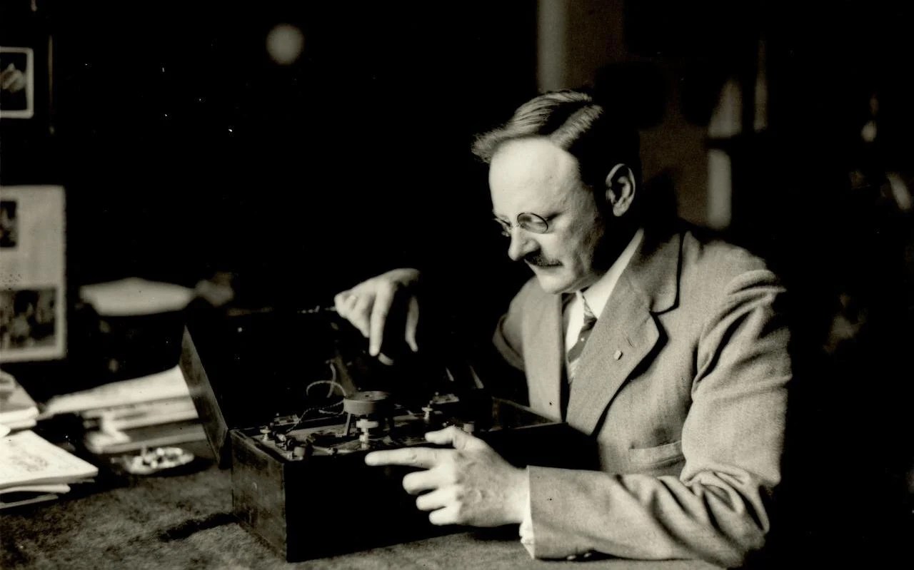 1906 — A first competitor is the Canadian Reginald Fessenden. In November 1906, Fessenden’s experiments succeeded in transmitting speech. A month later, on Christmas Eve, he made a broadcast from his workshop in Chestnut Hill in the state of Massachusetts. Fessenden played some records, including Händel’s Largo, and he played a solo of Gounod’s Oh Holy Night on the violin. Furthermore, of course, he read from the Gospel of Luke. It was, after all, Christmas Eve. Fessenden announced his program beforehand with Morse messages to radio operators of sea vessels. On New Year’s Eve, he repeated the broadcast. It was the first public broadcast of voice, albeit only a two-time event.