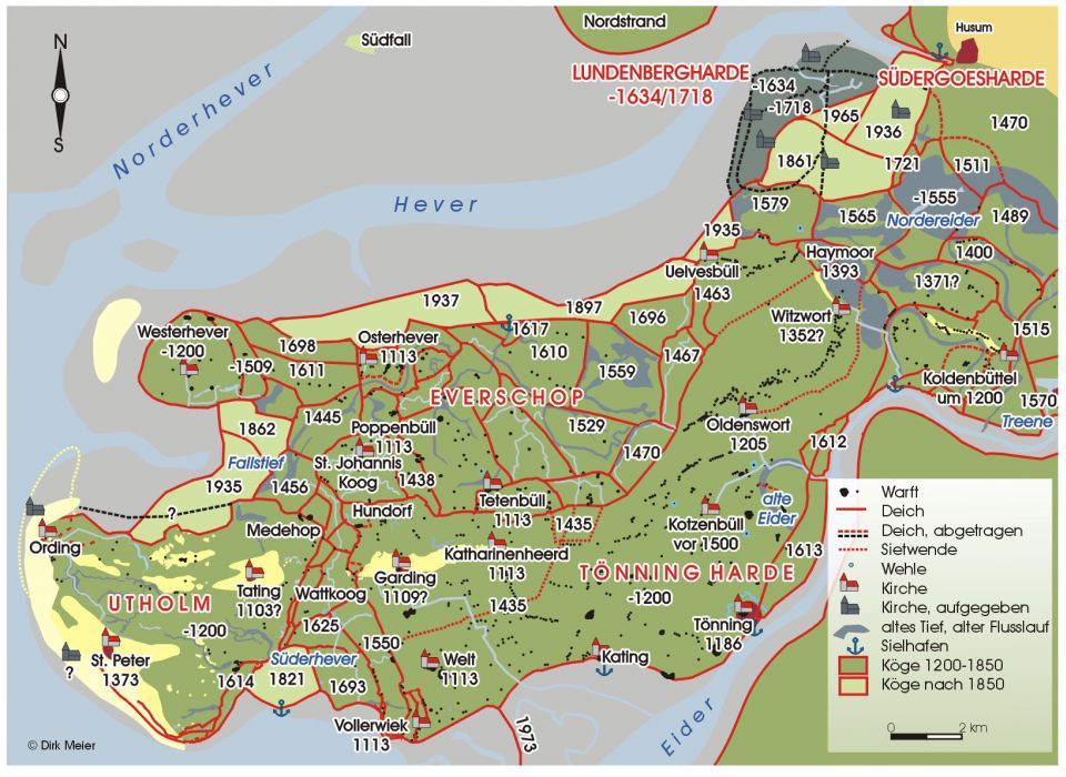 Despite the Saint Marcellus’s flood 0f 1362, also called the Grote Mandrenke ‘great drowning of men’, had devastated much of the landscape of Nordfriesland, modest land reclamation did take place in the fourteenth and fifteenth centuries. Some islands of the island groups Utholm and Everschop were unified during this period. In the fifteenth and sixteenth centuries, land reclamation took flight. In the year 1613, after extensive and systematic land reclamation through dyke building, construction of drainage systems, etc., the three islands of Eiderstedt, Everschop, and Utholm were finally united into what is now the peninsula of Eiderstedt. Numerous polders or Köge were created in the proces.