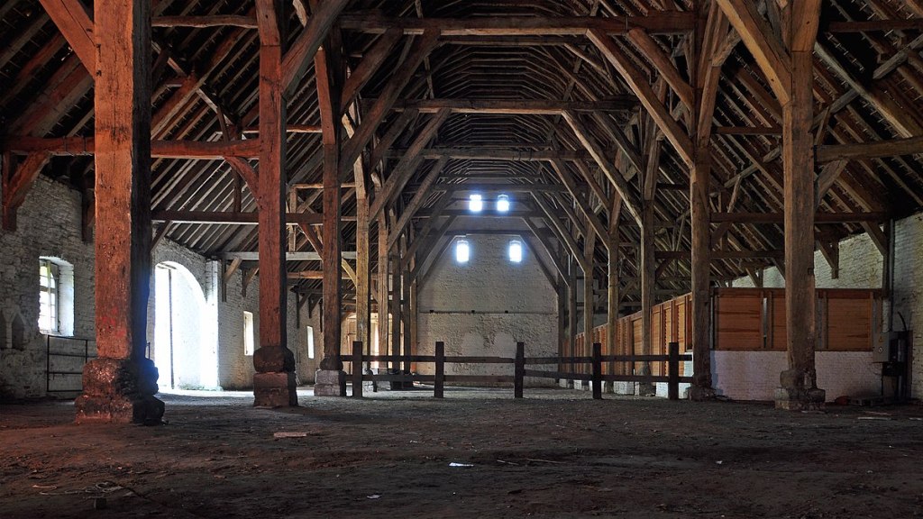 So, with the new stolp everything was organized under one roof, including the haystack. A hipped roof in the shape of a pyramid, up to seventeen meters high. Thanks to its hipped roof shape, low walls, and the roof-beam-bent timber construction, these spacious farms could resist heavy storms nevertheless. The design of these farm granges was fully dictated by cost efficiency. Realizing as much space as possible with a minimum of (expensive) building materials. Placing everything under one roof was already cheaper in relation to building materials, but it was less labour intensive to operate as well. Additionally, the use of wood, which was very expensive, too, was kept to a minimum through this smart construction. Timber, especially the strong durable timber needed for the supporting posts and beams, became scarcer through time and had to be bought and shipped all the way from Scandinavia, Poland, the Baltics, Ukraine, and Russia (Borghaerts 2021). Only the supporting elements were carried out in oak or high-quality pine. The rest of the roof was carried out in cheap and light spruce wood. Besides cost-effectiveness, this also kept the structure as light as possible.
