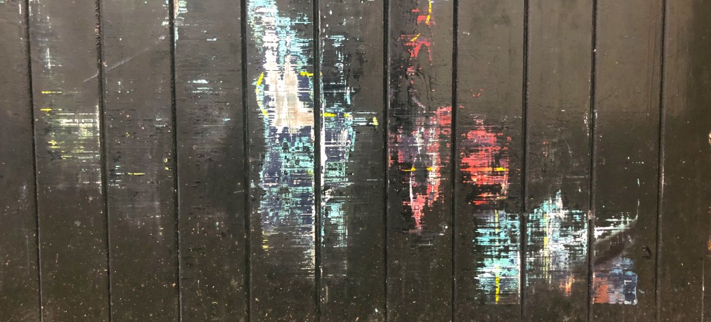 Through time, all the bastards’ pieces have been removed or repainted. The last visible evidence, as of the date of writing (2023), are these red colours of a piece on a sliding door shining through a more recent black paint coat. The piece was made in the Sint Odolphisteeg (‘Saint Odulf alley’) in the town of Harlingen in 1988; see image below. Interested in in the early-medieval history of Saint Odulf, read our blog post Stavoren. A balancer on a slack rope of religion, trade, land, water, Holland, and Frisia.