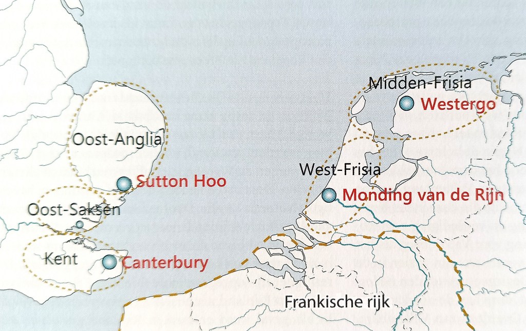 Cultural ties between the early Anglo-Saxons and Frisians remained strong until the seventh century. Their material culture and economies were remarkably similar. They spoke closely related languages and used the same runic alphabet. Well-connected through trade, political alliances, and elite networks, their kinship is evident from archaeological finds, linguistic studies, and DNA research. By around the year 600, small Anglo-Saxon and Frisian kingdoms had emerged along both sides of the southern North Sea coast. Among these were the three Anglo-Saxon kingdoms of southern East Anglia, Essex, and eastern Kent, and the two Frisian kingdoms located at the mouth of the River Rhine and in Westergo, in the northwest of the modern Netherlands (Nicolay 2017, 2023, Betten 2018, Lugt 2021). See the map below.