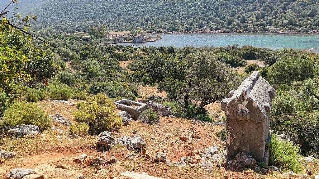 Closer to the sea, the bastard passed through yet another ancient archaeological site: the Hellenistic settlement of Aperlae — also spelled Aperlai — dating back to the fifth century BC. Tombs are scattered across the hillside, quietly beautiful. As is often the case in this region, little has been done to preserve the ruins or present the site to the public. Much of it is overgrown — frankly, most of it. And where the vegetation is kept at bay, it is largely thanks to grazing goats and sheep.