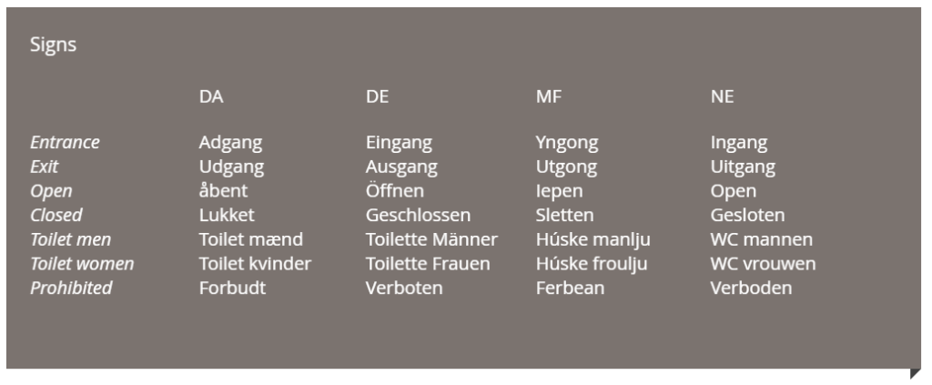 Legend: DA = Danish, DE = German, NE = Dutch, MF = Mid Frisian (i.e. the province of Friesland).